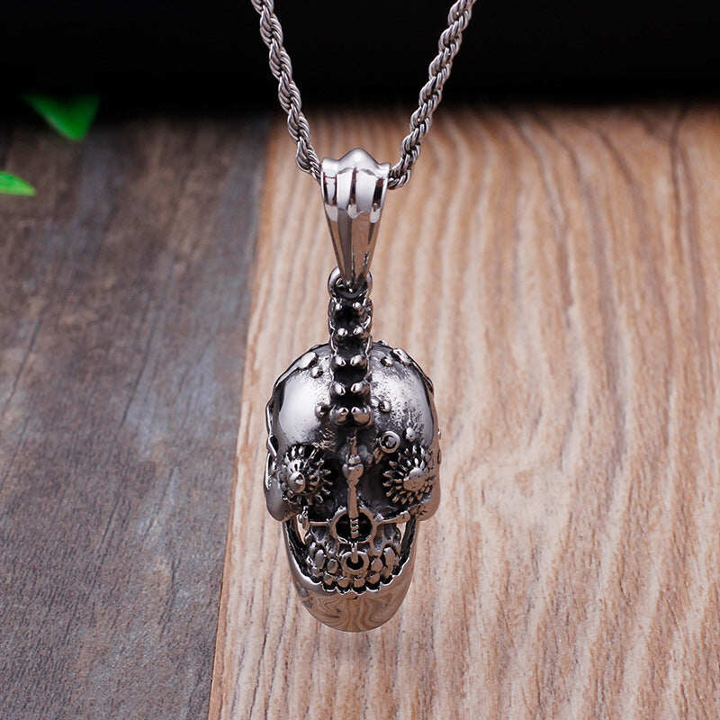 The style is made in stainless steel and has a skull design with bullets mohican and cog details. This pendant is set on a high quality 3.2mm, 18″ stainless steel belcher chain.
