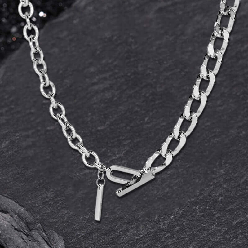 This stylish spliced Cuban chain necklace is finely crafted and features an OT buckle design for easy access and secure fit. Made of stainless steel, hand-stitched, no fading, no rust. A must-have for everyday wear.