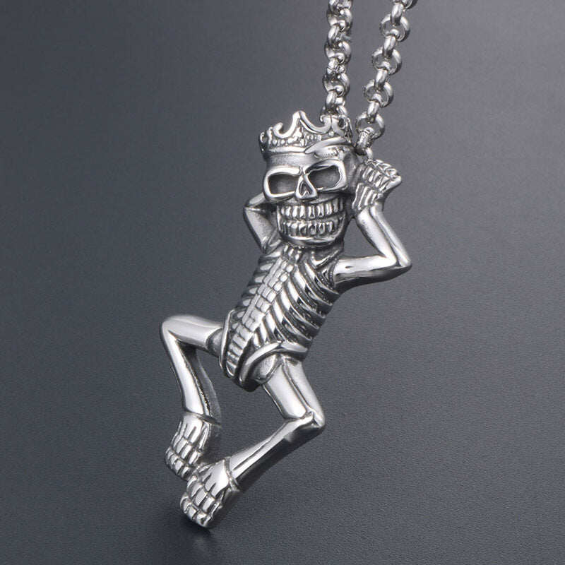 A fun and unusual pendant of a skeleton king wearing a crown, made in stainless steel.